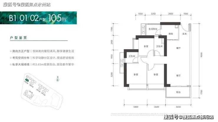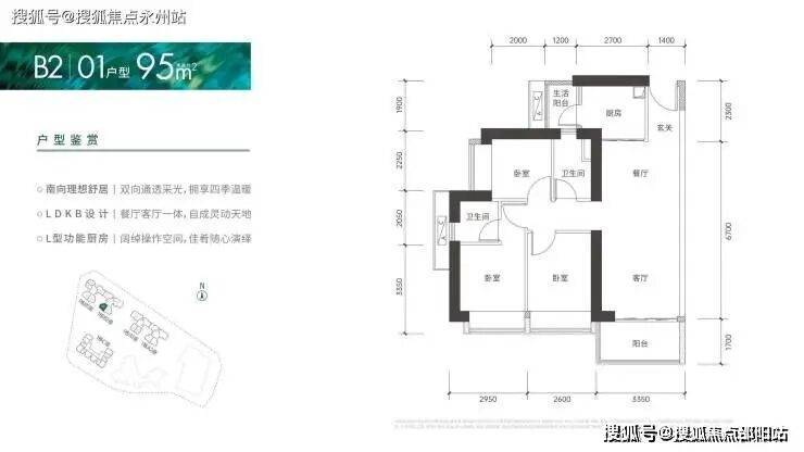 95㎡的3房2厅2卫:仅1栋B2座01户型,设计的是竖厅格局,客厅3.35米开间,进门入户玄关,LDKB一体化设计,3个卧室分别做到了2.95米/2.6米/2.25米的宽度,L型厨房还带1个小生活阳台,卫生间干湿分离,得房率:72%(不含赠送),阳台朝西南向。