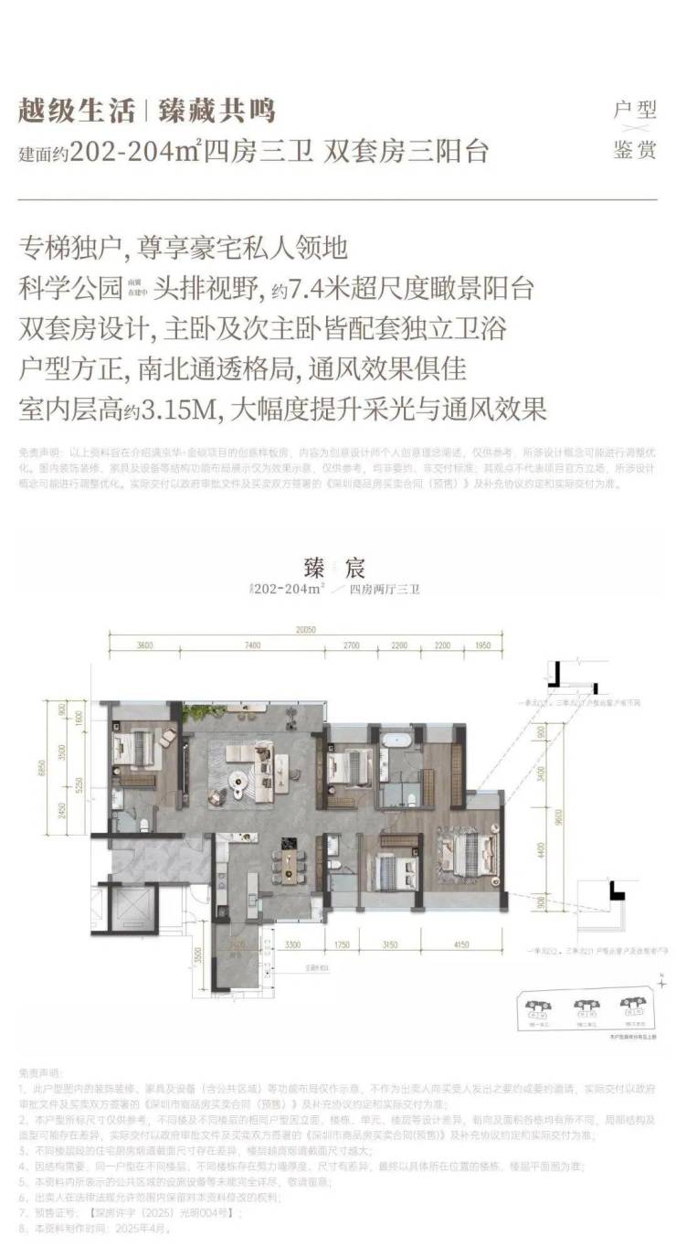 204㎡的4房2厅3卫,设计的是横厅南北通透格局,独立专梯入户,客餐厅7.4米开间,LDKB一体化,超大客厅+双套房设计,4个卧室分别做到了主卧33㎡/次卧16.1㎡/次卧13.54㎡/次卧11.61㎡(包含墙体飘窗),客餐厅出7.4米长的观景大阳台,直面科学公园,L型厨房带1个生活阳台,卫生间干湿分离,东北朝向。