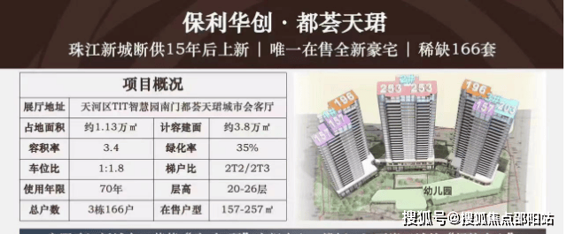 保利华创都荟天珺位于广州天河珠江新城东区、金融城核心,是保利发展 “天字系” 顶序作品,也是珠江新城时隔 15 年的全新纯住宅地标。项目总占地约 1.13 万㎡,总建面约 3.8 万㎡,由国际顶尖设计团队操刀,采用全玻璃幕墙流线型外立面,整体抬高约 30 米打造空中奢境。产品主打建面约157-253㎡的纯住宅大平层,货量极度稀缺(仅 166 套),层高约 3.15 米,拥有270° 环幕观景与约 35% 绿化率的中央园林双重视野,以 “城市封面行宫” 的尺度重新定义广州塔尖居住标准。