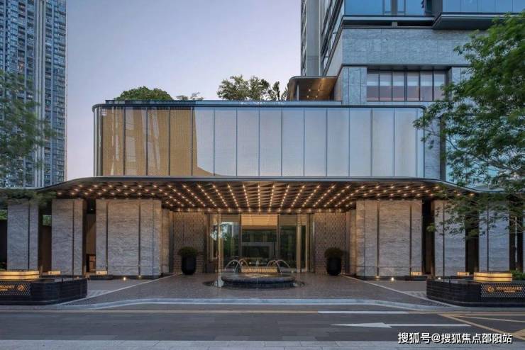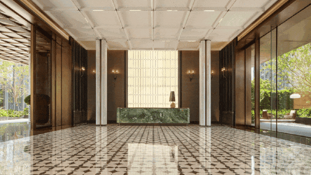 酒店式社区大堂:朝向广场,入口前场、门廊、大堂、内庭院、单元大堂组成的归家动线,配合建筑、景观、室内、标识、灯光一体化设计,汲取糅合后的南洋文化元素细节,把酒店式归家仪式感拉满,彰显非凡气度。