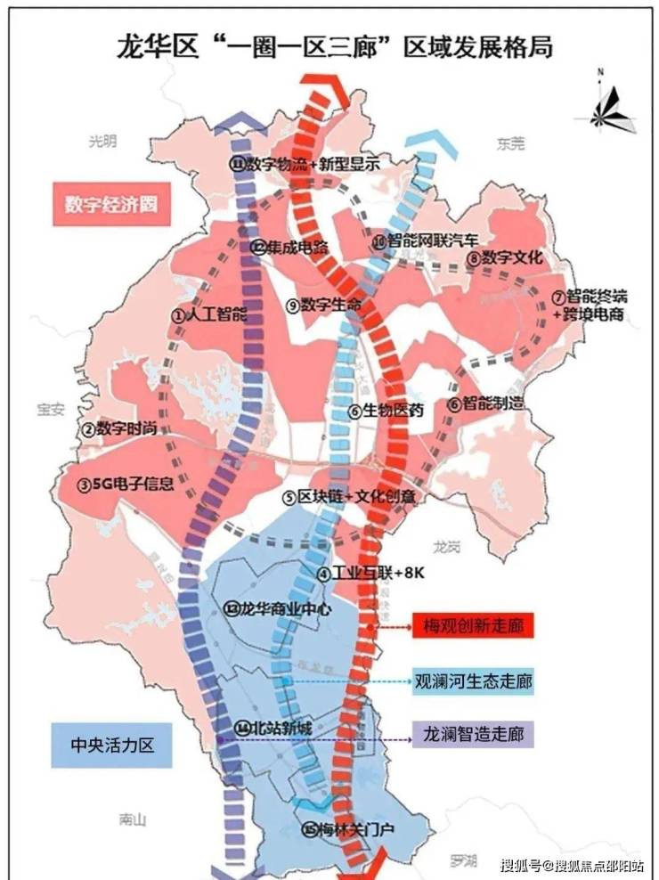 根据《龙华区城市更新和土地整备“十四五”规划》,构建“一圈一区三廊”空间格局,北部打造全球万亿级数字经济圈,南部打造深圳中央活力区,打造纵贯南北的三大都市走廊(梅观创新走廊、观澜河生态走廊、龙澜智造走廊);同时,提及提升北站国际商务区、龙华国际商圈重点片区发展能级。