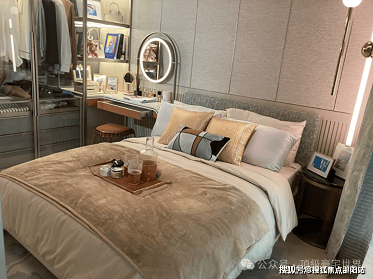主人睡房以长型设计,摆放双人床后位置仍见宽敞,住户亦可三边落床。双人床面向云石图案特色墙,提升空间格调。旁边亦附有透明高身衣柜,十分实用。