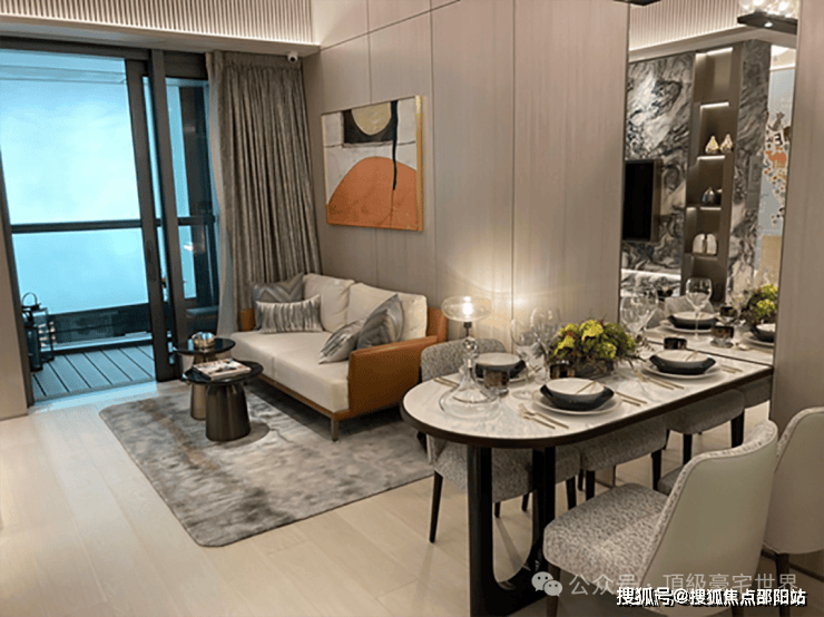 间格实用,厅区采长形设计,客饭厅泾渭分明。单位以典雅自然风格打造,客厅放有长形梳发,配撘两张圆形茶几。值得一提的是,单位的22呎露台与16呎工作平台合并,,空间更充裕。