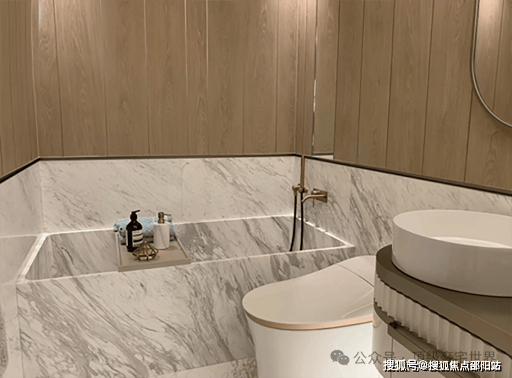 浴室备有浴缸,可供住户浸浴。而墙壁及地下皆白云石纹图案铺砌,延续高雅格调。