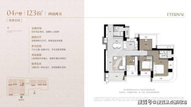 采用双龙抱珠格局,灵活适配成长型家庭。LDKB一体式布局,配备270°环幕主卧套房、U型厨房及七大飘窗,空间动静分离,实用且可变。