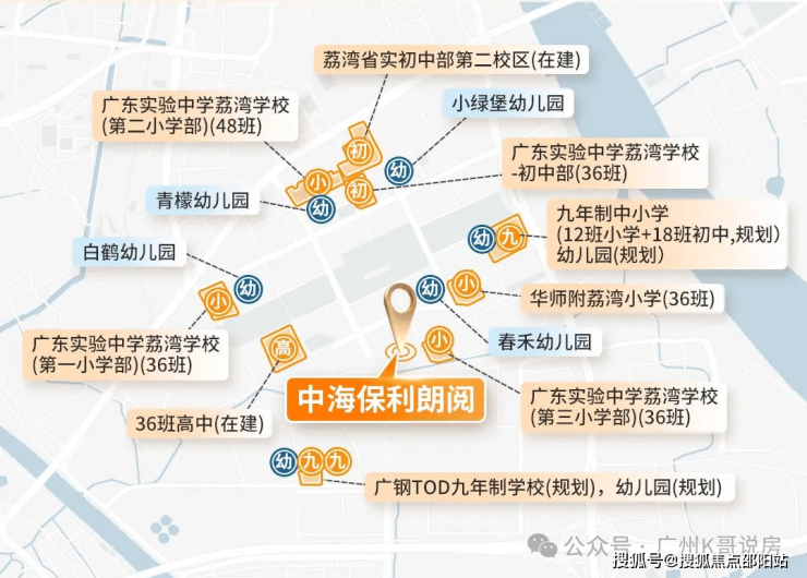 教育是项目核心优势,与已开学的广东实验中学荔湾学校第三小学部仅一路之隔,步行距离约 215 米,实现 "目送式" 入学。项目自身配建 36 班省实初中部与 36 班真光高中部,周边 3 公里内聚集 32 所学校,形成全龄优质教育圈。