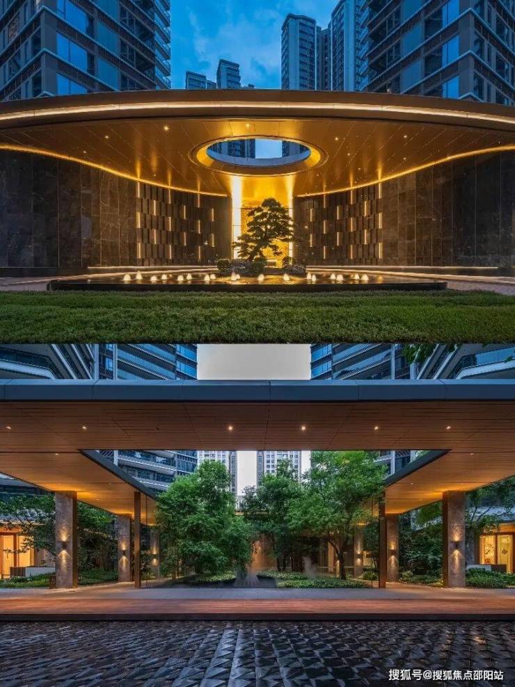 大门霸气横跨约61米,中间环绕了一圈朦胧水幕,正中央则挺立着一棵罗汉松,据说价值200万。豪宅尺度,拿捏得妥妥的。