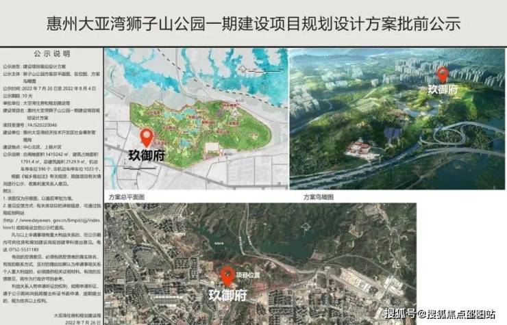 玖御府位于大亚湾中兴北路与科技路交叉口西北200米.项目共分两期,第一期为叠墅及小高层,共6栋,第二期为超高层,共3栋,主力户型为250平左右的大平层及叠墅,项目内部以日式禅宗园林打造其主题园区,整体区位位于大亚湾中心区,南侧紧邻大亚湾主干道龙海二路,周边临近大亚湾大动脉-大亚湾大道,距离惠州南高铁站仅12分钟,距惠深沿海高速澳口收费站仅1.8公里。周边三公里内范围分布有万达广场、cocogarden、大润发、天虹、灿邦新天地等大小型商业体,小区设置有国际双语幼儿园、项目后面规划建设一个小学和一个初中。