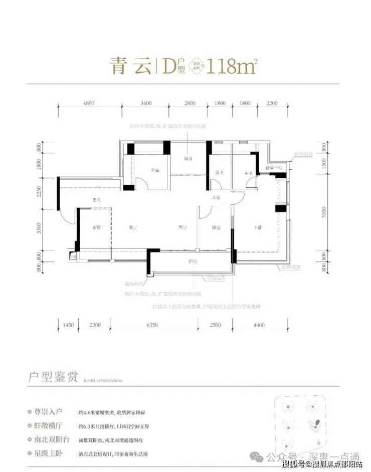118㎡的4房2厅2卫,设计的是横厅南北通透格局,进门赠送约4.6㎡的入户玄关(不计算在户型图内),客餐厅6.35米开间,LDKB一体化设计,4个卧室分别做到了主卧22.5㎡/次卧11.56m²/次卧9.52㎡/次卧8.25㎡(包含墙体飘窗),主卧带设备平台,客厅连接次卧出6.25米长大阳台,L型厨房,得房率约81%(不含赠送),阳台主朝东南向。套内面积95.58m²+赠送面积31.04m²=实际使用面积126.62m²,加上赠送后得房率约107.3%。