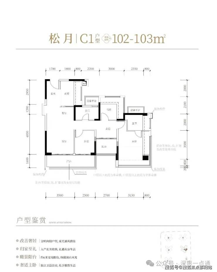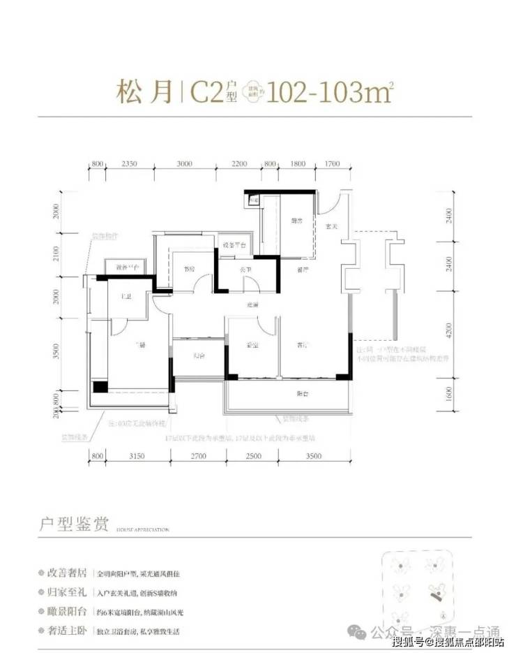 102-103㎡的4房2厅2卫,C1-C2户型,设计的是经典竖厅格局,进门入户玄关,客厅3.5米开间,LDKB一体化,S墙设计预留冰箱卡槽位,动静分区,四开间朝南,4个卧室分别做到了主卧17.98㎡/次卧8.37㎡/次卧8.1m²/次卧7.75㎡(包含墙体飘窗),L型厨房,公卫干湿分离带1个约2m²的设备平台,得房率约81%(不含赠送),客厅连接次卧出9.6m²的观景大阳台,东南或西南朝向。套内面积83.43m²+赠送面积23.86m²=实际使用面积107.29m²,加上赠送后得房率约104.16%。