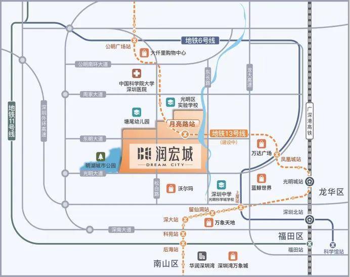 华润润宏城位于光明区凤凰街道塘尾社区,光明大道和东长路交汇处的西北侧,刚好在13号线“月亮路站”附近,北部接壤东周路。