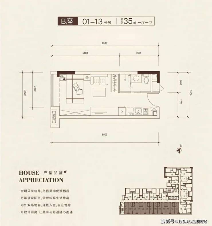 单房户型,东南朝向视野开阔,开间3.1米配有落地窗,采光性能佳。开间进深比良好,空间利用充分,功能全面。厨卫空间紧凑实用。
