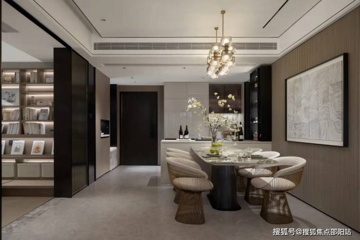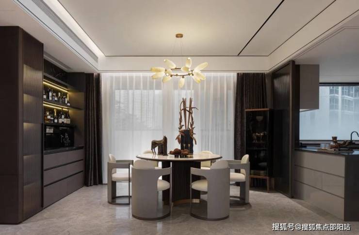 霸气的客餐厅厨空间内,实现270度全玻璃幕墙采光,让城市璀璨化身日常生活背景,打开大平层多元生活演绎。