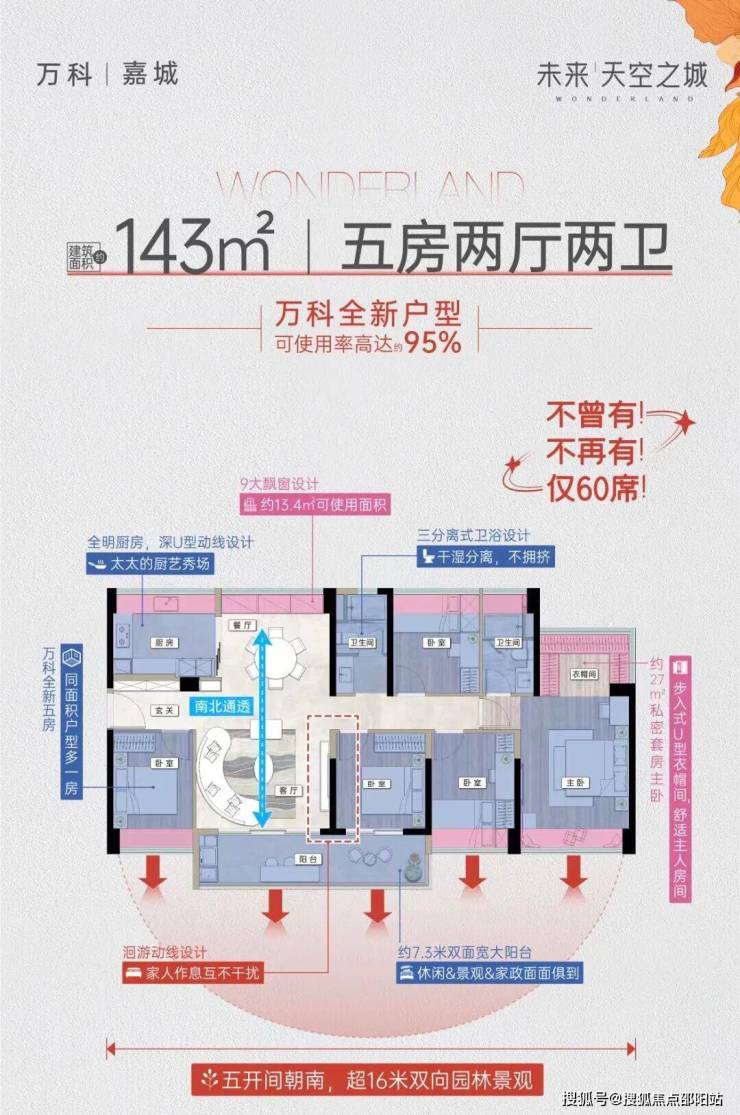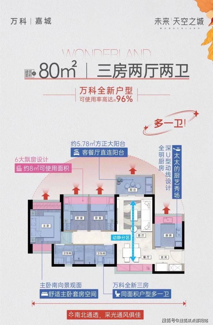 其中建面约80平户型,最高使用率高达96%,实现四开间朝阳,约5.78㎡方大阳台,主卧可实现南北对流,同等面积多一卫……每个点都戳中刚需的心。