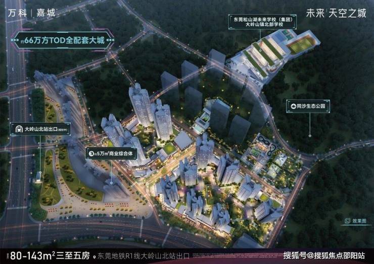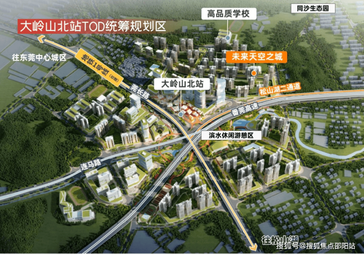 项目位于大岭山北站TOD,规划约66万平的体量,打造一座能代表城市的TOD未来超级生活大城。在项目旁边,是东莞松山湖未来学校教育集团成员之一的 大岭山镇北部学校 ,据悉,该学校为公立小学,由未来天空之城项目配建。