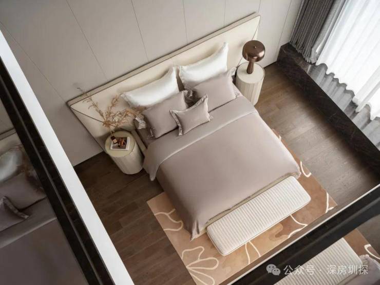 卧室以木棕与静白拼接,营造安谧、舒适又温柔的艺术氛围。自然质朴的原木色与灰白色调相融,尽显轻盈温馨,带来自然愉悦之感。圆润造型柔化室内氛围,弱化空间秩序与理性,平衡体验,释放温馨暖人的视觉效果。