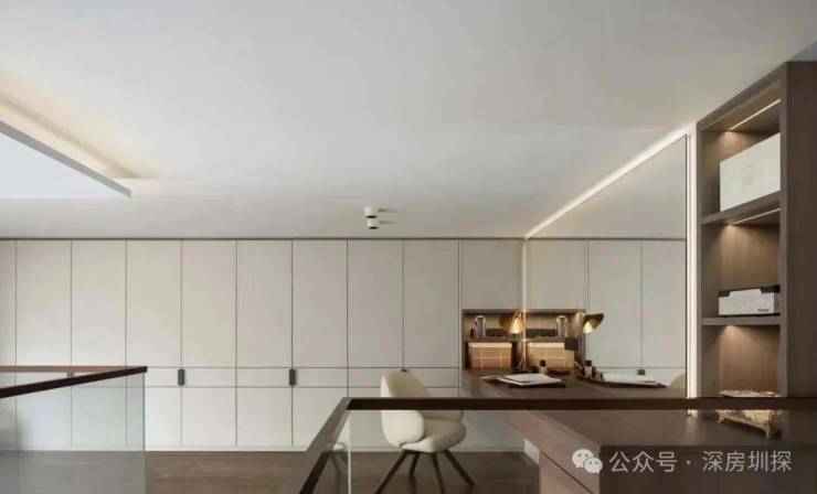 二楼办公区,暗藏梁提升视觉层高,玻璃围挡也在一定程度拉伸空间高度。木质风格营造静谧氛围,与全屋格调呼应。整面墙开窗,既引入大量自然光,又拓宽观景视野。工作间隙极目远眺,俯瞰有 “深圳维多利亚港” 之称的深圳湾,惬意享受。