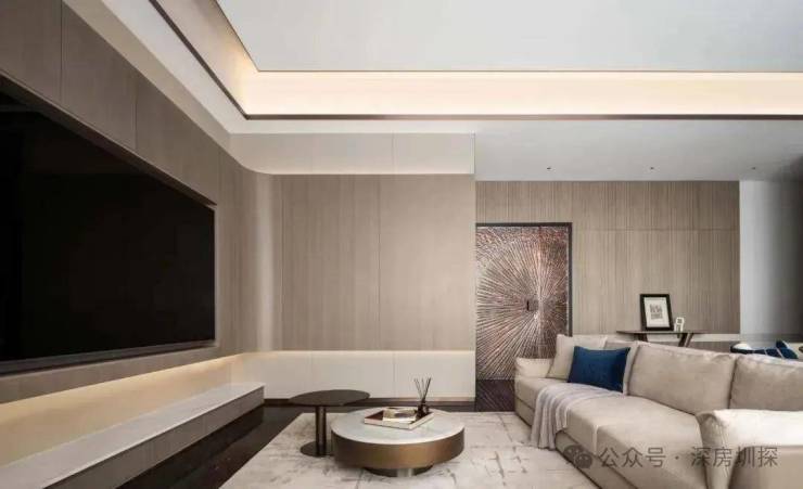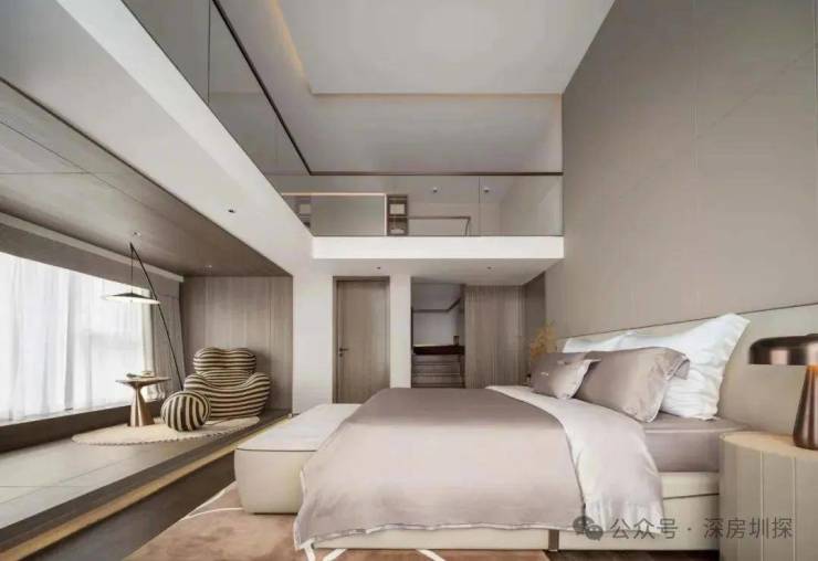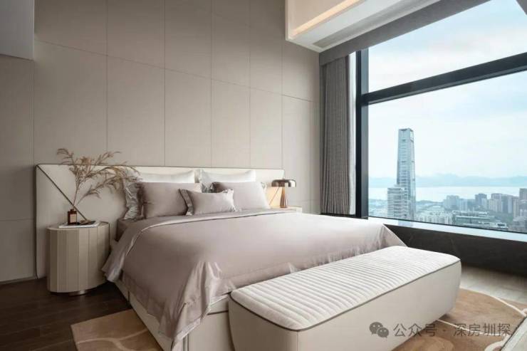 借卧室特殊空间,向外拓展出休闲区。巨幅落地窗,最大程度引入自然光,拓宽视野。白天,此处是观景佳处,深圳湾壮阔海景尽收眼底,看海鸟戏浪,内心顿感安宁。夜晚,华灯初放,这儿成了独酌静思的精神圣地。一杯美酒,在暖光下,酒杯与无尽夜色共舞,一天疲惫随之消散。
