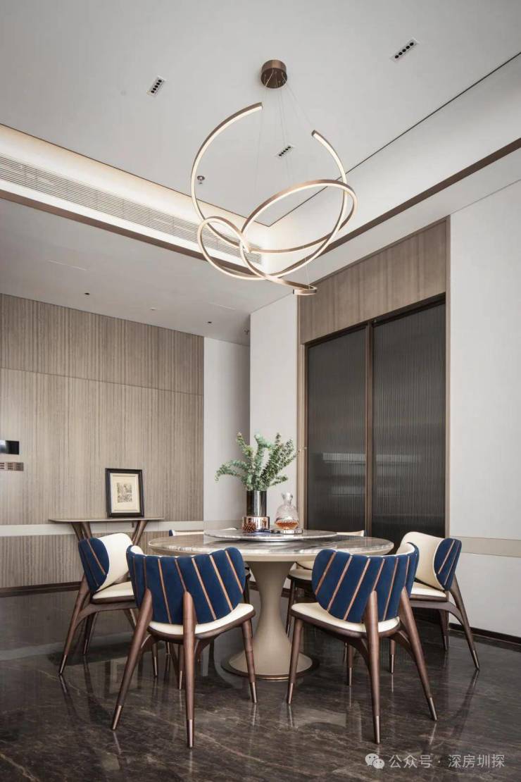 古铜不锈钢的坚硬,撞上大理石凝固的艺术内涵,交融出高雅质感。多样材质丰富空间层次,以简约之形精妙结合。清亮光泽在与木饰面交接处悄然隐没,生动韵味于其间自在流转,营造和谐自然的艺术氛围。
