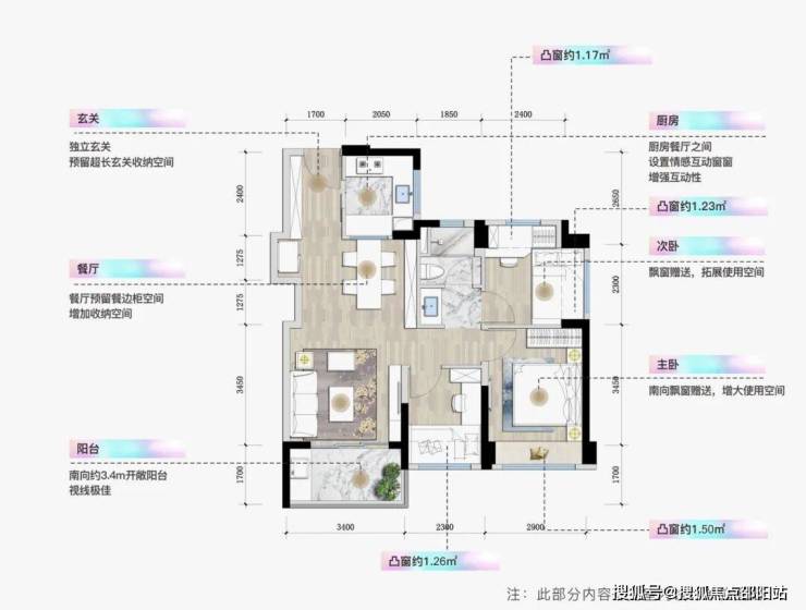 整体户型方正实用,多飘窗利用。