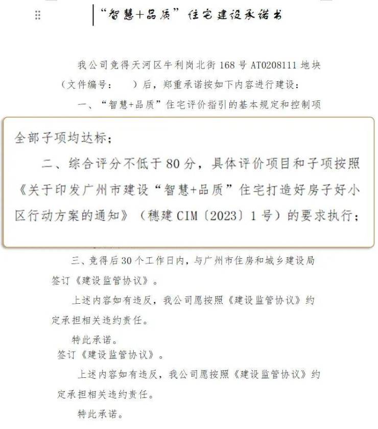 再者,作为广州首个“智慧+品质”试点小区,在土地出让条件中,就非常明确的点出广州的野心了——这个项目,就是要积极探索好房子的落地实践,要在满足基础标准之上,不断探索更高品质标准,成为“广州好房子的样板与标杆”。