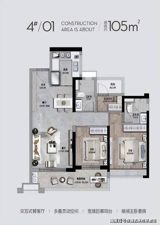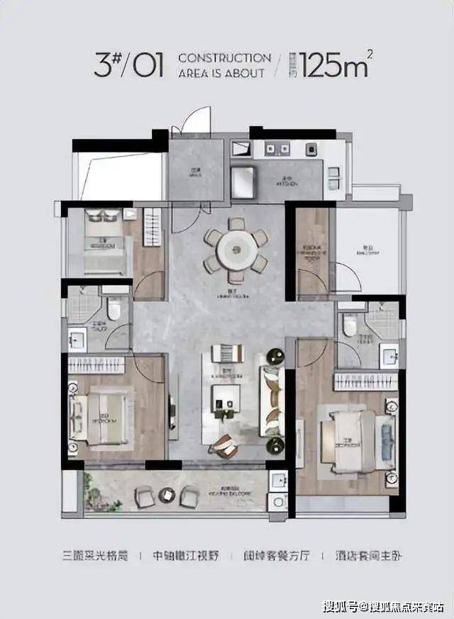 - **105㎡三房两厅两卫**:南向望江入门级户型,三开间朝南,主卧270°飘窗引景入室,适合金融新贵首置;