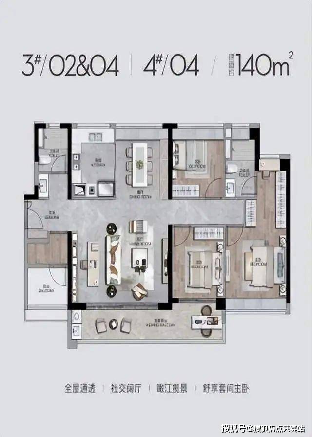 - **140㎡四房两厅两卫**:南北对流双阳台,约7米景观阳台连通客厅与次卧,主卧套房配备独立衣帽间与卫浴,二孩家庭优选;