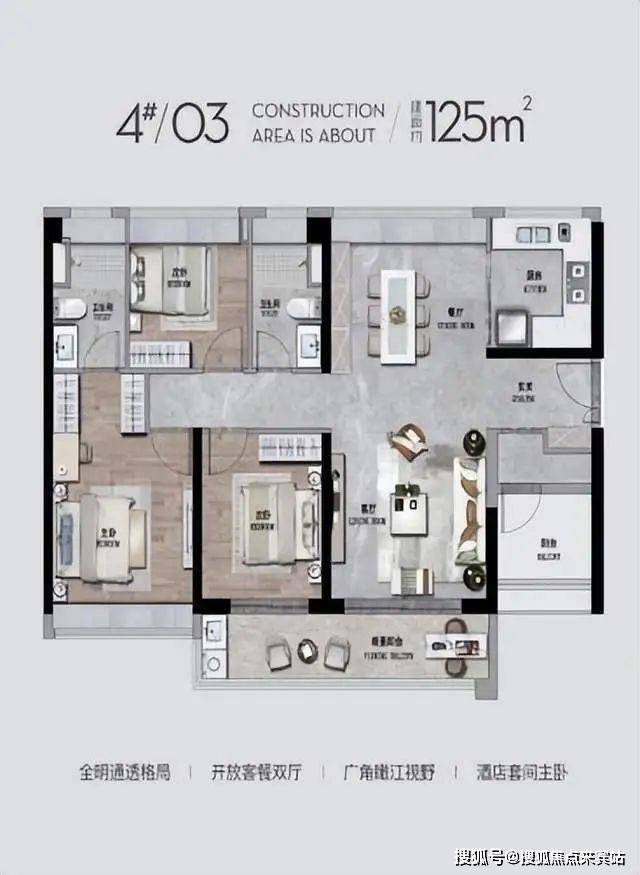 - **253㎡四房两厅三卫**:岛尖头排专属大平层,270°环幕阳台直面三江,约50㎡客餐厨一体化空间,双套房设计(主卧+长辈房),标配保姆间,定义塔尖人居天花板。