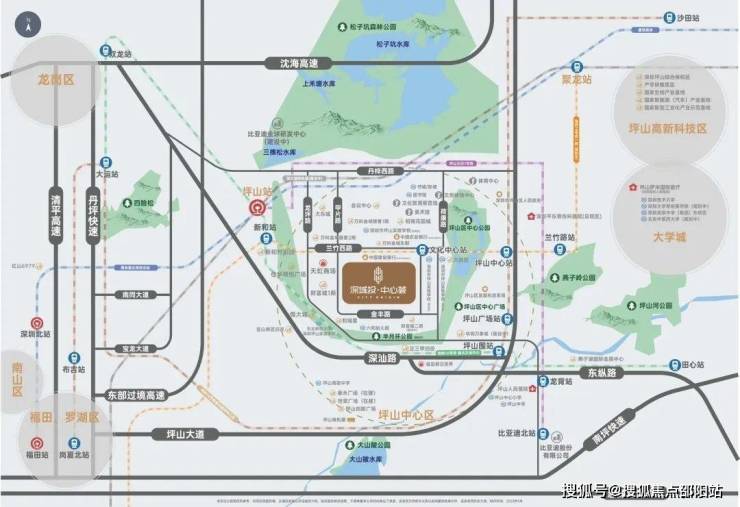 坪山中心:坪山中心区位。近坪山高铁站,门口公交站。位于14/16号地铁辐射经济圈内,占据坪山交通路网先机,畅享穿梭旁边客流。