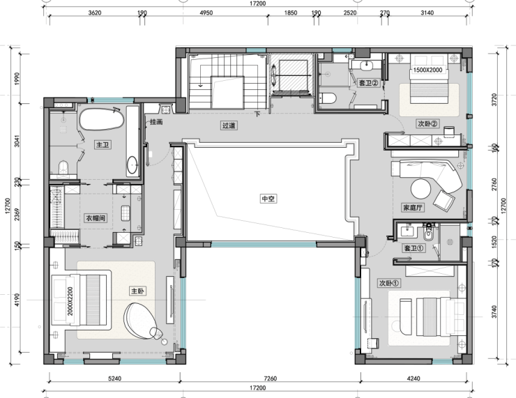 二层卧室布局错落有致,挑空区丰富空间层次;