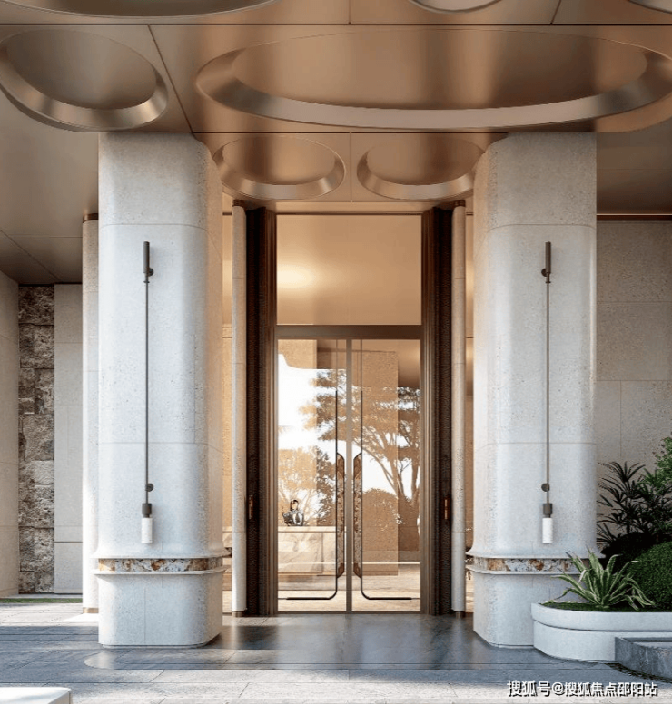 车行大门做了殿堂级落客区,设有天幕和水景,非常具备归家仪式感。每栋设有独立入户大堂,风格与大门相呼应。