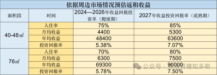预计2023年起,30-60㎡一房单位租金约为4200元/月,基本可以覆盖房贷,实现投资资金回笼周期短、投资回报率高的可能性。