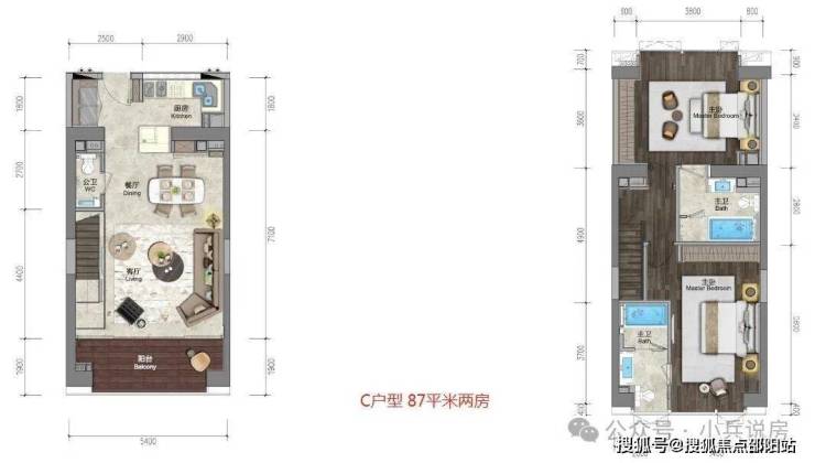 ★79㎡复式三房两厅三卫 南北通透,5.4米大开间,复式下层餐厨客厅连宽景阳台,另带一个法式小阳台。复式上层私密卧房全明采光,动静分区私享个性生活。另一个次卧带衣帽间。