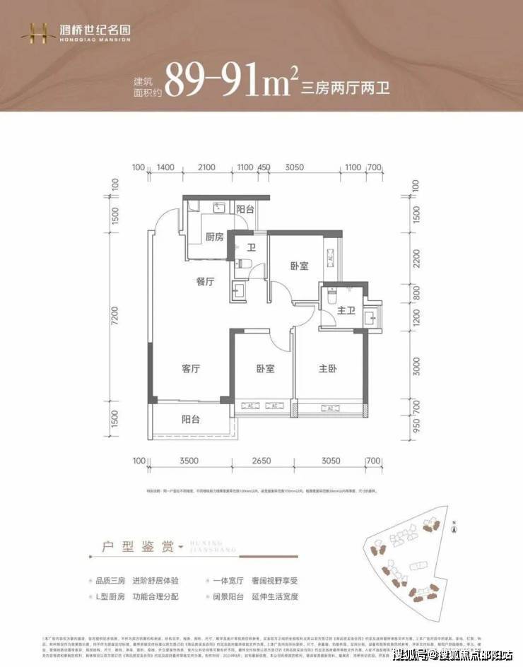 91㎡的3房2厅2卫:竖厅南北通透格局,客厅3.5米开间,LDKB一体化设计,3个卧室分别做到了3.05米/2.6米/2.55米的宽度,L型厨房带1个小生活阳台,卫生间干湿分离,阳台主朝正北向