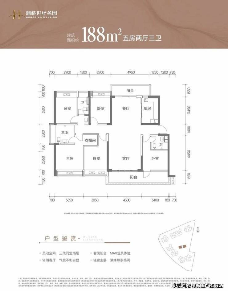 188㎡的5房2厅3卫:竖厅格局,南北通透双阳台,客厅4.3米开间,LDKB一体化设计,双主卧套间设计,5个卧室分别做到了3.65米/3.4米/3.05米/2.9米/2.7米的宽度,L型厨房带1个小生活阳台,公卫三段式分离,客厅阳台连接次卧出7.7米长的大阳台,主朝正南向。