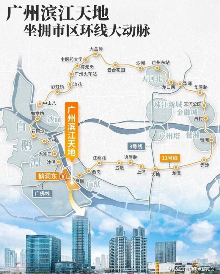 广州11号线鹤洞东站地铁上盖,拥有3横2纵大路网+公交站场+水上巴士,集水、陆、轨等多维交通方式于一体,半小时城央生活圈,1小时湾区生活圈。