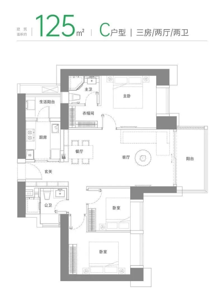 瞰景三房,飘窗、阳台拉开居住视野,主卧私享功能产备 LDK一体化设计,打造无边界、社交化的餐客厨系统