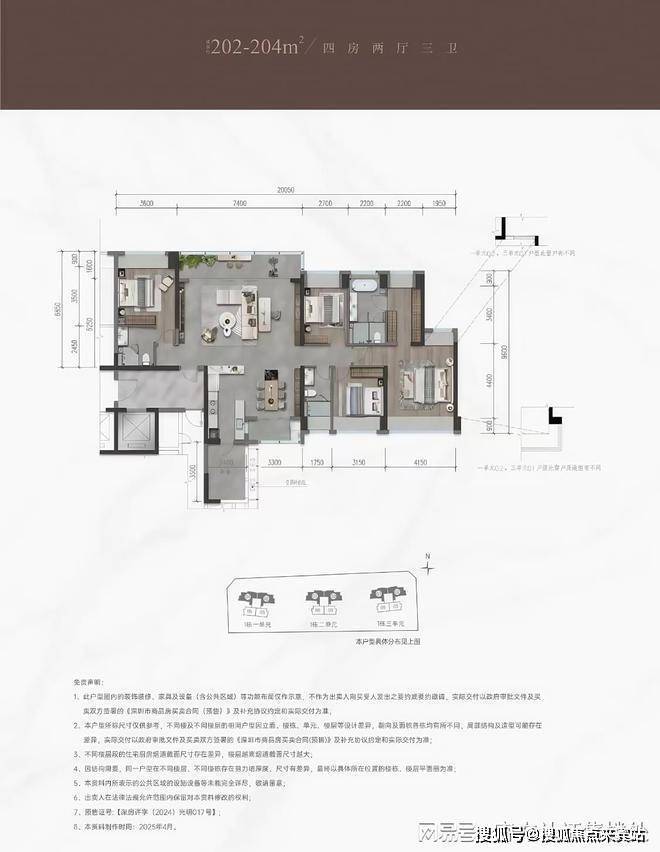 202-204㎡四房两厅三卫(简装交付):南北通透横厅,7.4米客餐厅开间,LDKB一体化设计,双套房配置,主卧33㎡带独立卫浴及7.4米环幕阳台,直面科学公园景观。