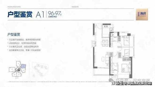 96-97㎡3房2厅2卫02(A1)户型,设计的是竖厅两个半开间朝东南,客厅开间3.5米,LDKB一体化,S墙设计预留冰箱卡槽位,动静分区,次卧东北向。