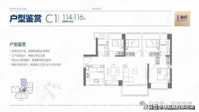 114-116㎡4房2厅2卫01(C1)户型,设计的是横厅朝东南向,客餐厅开间6.6米,LDKB一体化设计,四开间朝南,全屋7面飘窗,主卧套房+步入式衣帽间,3个次卧朝西北向。