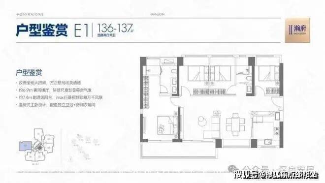 136-137㎡4房2厅2卫07(E1)户型,设计的是横厅朝西南,客餐厅开间6.9米开间,LDKB一体化设计,四开间朝南,全屋7面飘窗,主卧套房+步入式衣帽间,3个次卧朝东北向,客厅连接次卧出7.4米长的超大阳台。