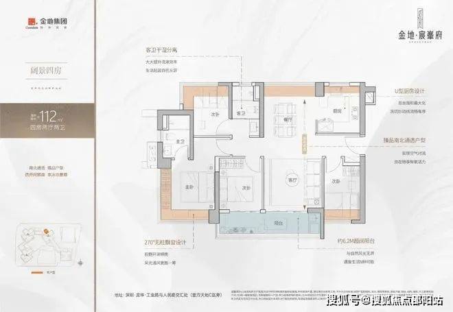 -112㎡四房两厅两卫:整个户型南北通透,做到了市面少有的四开间朝南。高效十字动线串联起客餐厨、阳台、卧室等功能区,既避免了“无效空间”的浪费,也同步提高了室内视线通达性。