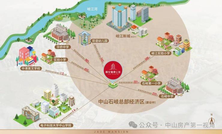 项目所处石岐总部经济区的“焦点”位置,目前岐江新城的落地规划90%都在总部经济区,总面积约1.1平方公里,规划投资超500亿,其中市政公建配套投入约45亿未来将打造成集金融商务、医疗体育、休闲娱乐、文化教育等于一体的高端综合设施,服务城市新中心,成就中山市总部经济腾飞新高地。