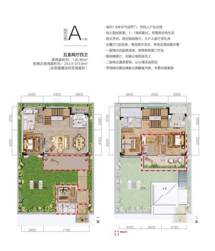 五室两厅四卫,建筑面积约126.95㎡,拓展后使用面积约278.9—330.9㎡(含房屋赠送和花园面积)