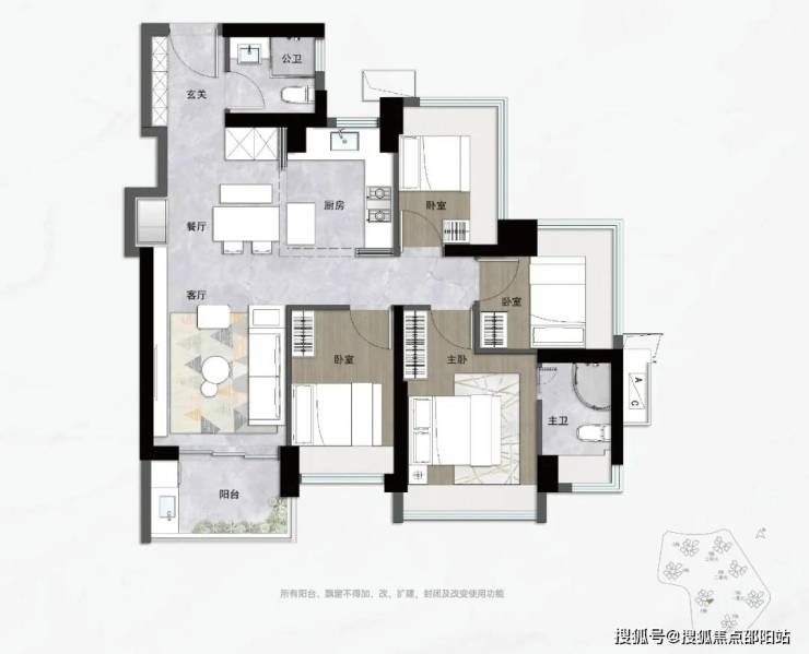 约89㎡三房两卫户型主打舒适,方正实用。