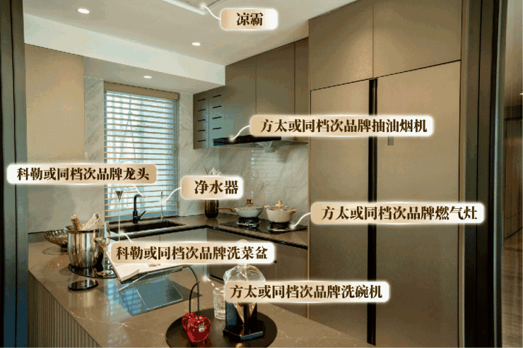 全屋配置了新风系统、热水器,厨房额外配置凉霸、净水器,主卫更升级为智能马桶。