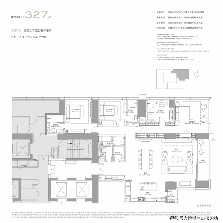 面积设计:300、400、460、570、1000平米纯粹大户型,空间方正,极致私密。