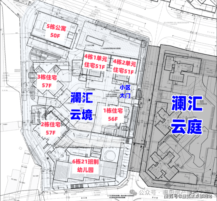 合正观澜汇云境,由合正集团公司打造,总占地面积约2.96万㎡,总建筑面积约36.21万㎡,计容建筑面积约26.23万㎡,容积率8.5,绿化率35.09%,共由4栋住宅+1栋酒店+1栋幼儿园,其中1栋住宅56F,2栋/3栋住宅57F,4栋1/2单元住宅51F,5栋酒店50F,6栋是1所21班制幼儿园。