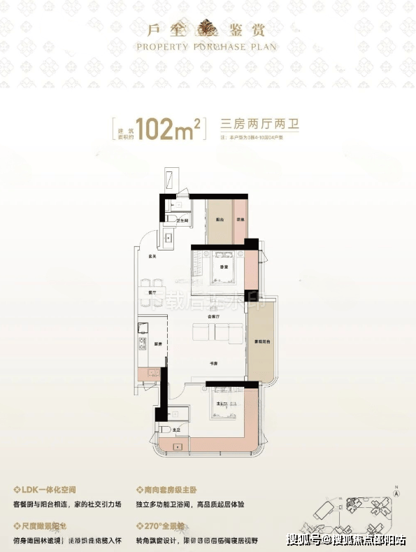 102㎡的3房2厅2卫,设计的是竖厅格局,LDK一体化设计,四开间朝南,主卧270°全景舱,L型厨房,公卫三段式干湿分离,得房率约94%(包含赠送),东南朝向看海景视野。