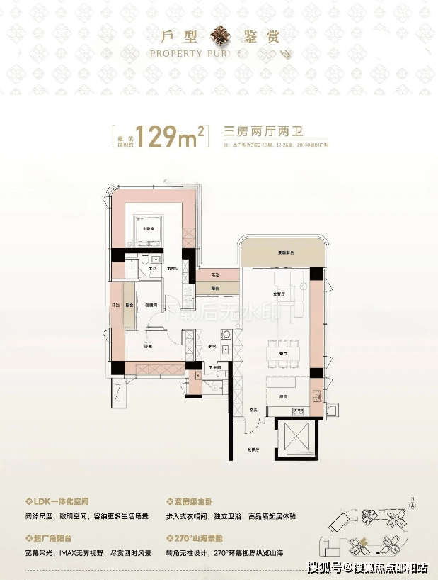 129㎡的4房2厅2卫,设计的是竖厅格局,尊享独立电梯入户,LDKB一体化设计,动静分区,主卧270°无柱转角全景舱,L型厨房+岛台设计,公卫三段式干湿分离,得房率约105%(包含赠送),东北朝向看一线梧桐山景观。